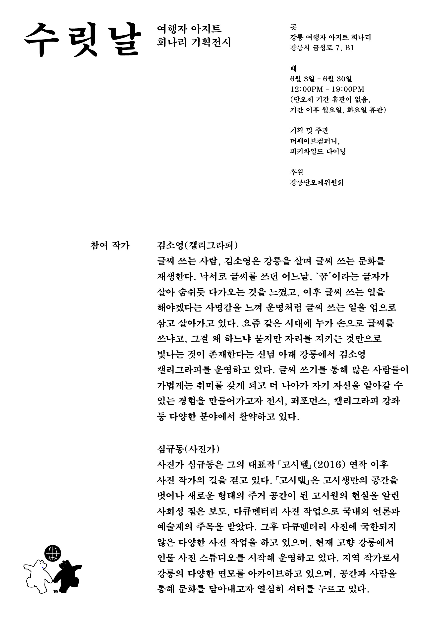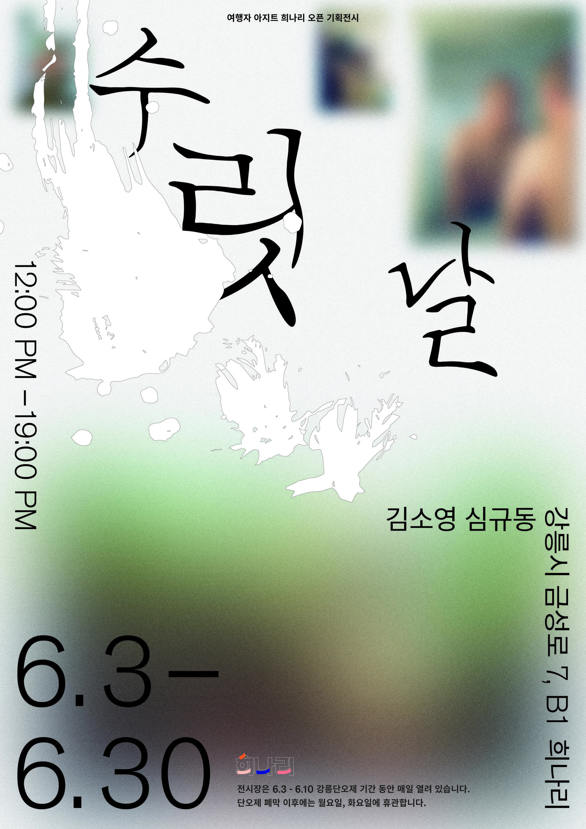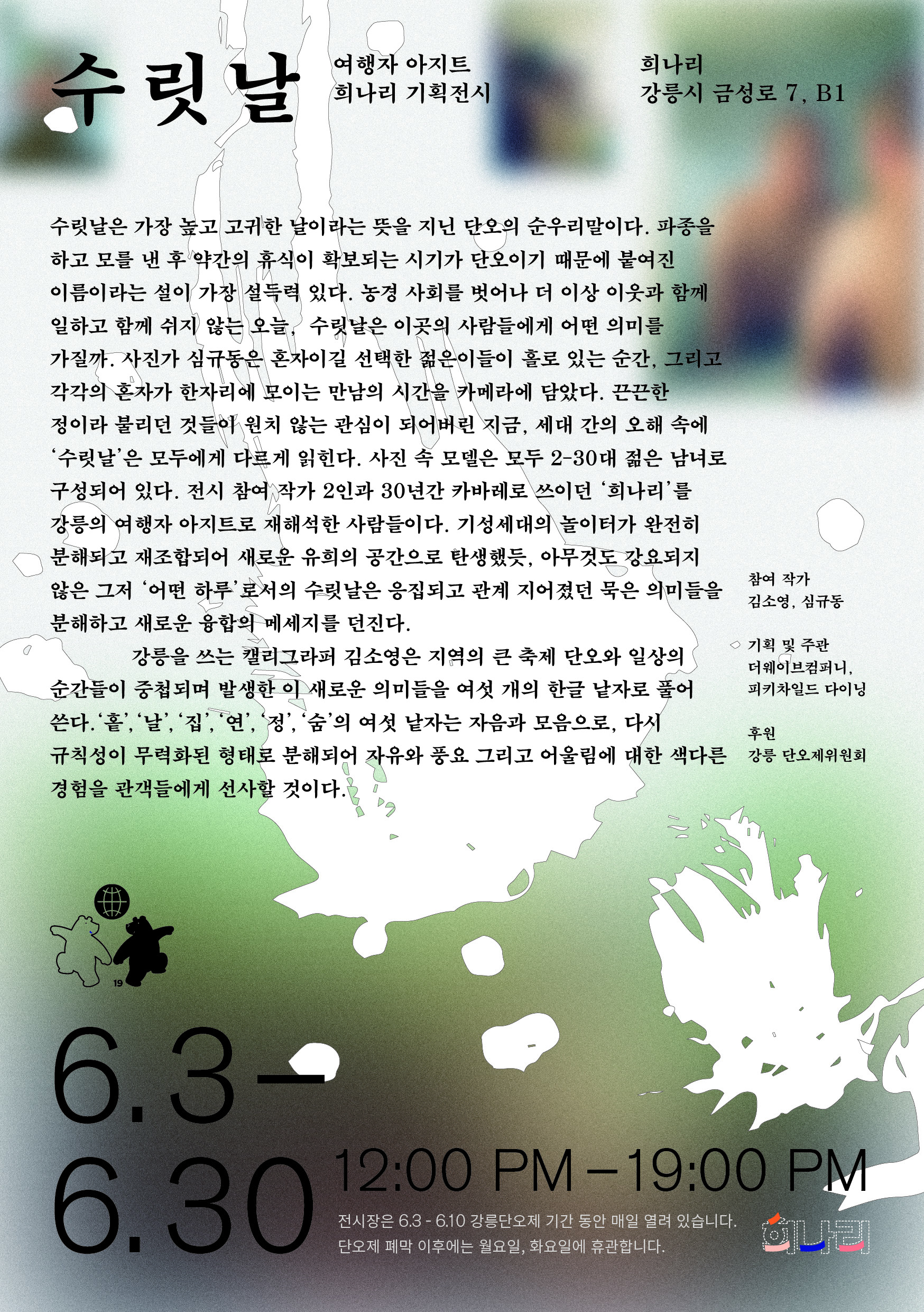 가장 높고 고귀하다는 뜻을 가진 순 우리말 수릿날은 단오를 부르는 또 다른말입니다. 2019 강릉단오제의 단오놀자 프로젝트의 연장선상에서 셀렉트샵 희나리와 더웨이브컴퍼니는 단오와 일상을 연결하는 기획전시 수릿날을 진행했습니다. 강릉을 쓰는 한글작가이자 캘리그라퍼 김소영, 고향에서 아날로그라피 스튜디오를 운영하고 있는 심규동 작가가 참여하여 강릉단오제가 갖는 자유와 풍요 그리고 어울림에 대한 색다른 해석의 작품들을 만나봅니다.