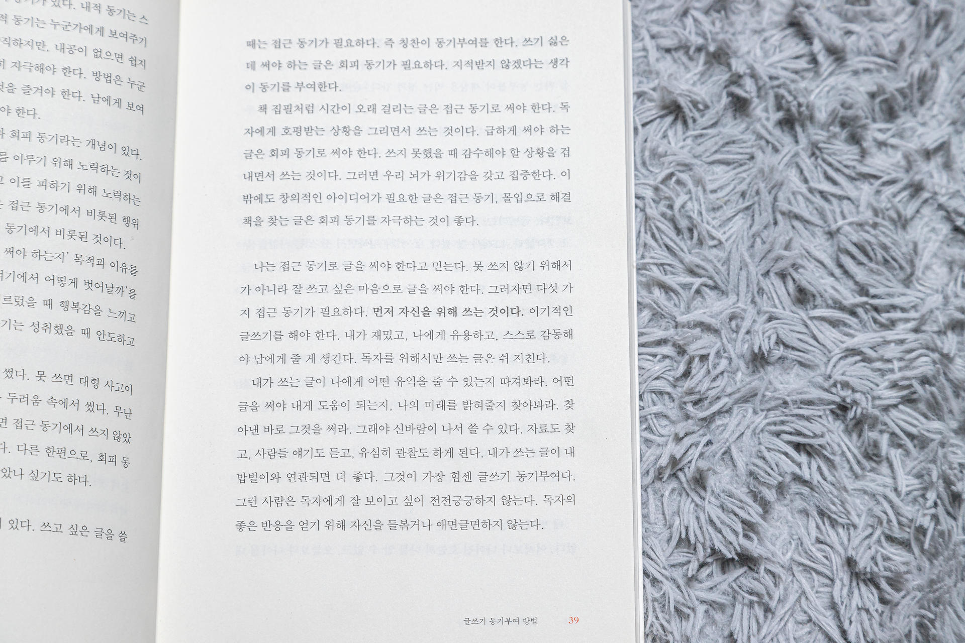 못 쓰지 않기 위해서가 아니라 잘 쓰고 싶은 마음으로 글을 써야 한다. 그러자면 다섯 가지 접근 동기가 필요하다. 먼저 자신을 위해 쓰는 것이다. 이기적인 글쓰기를 해야한다. 내가 재밌고, 나에게 유용하고, 스스로 감동해야 남에게 줄 게 생긴다. 39쪽