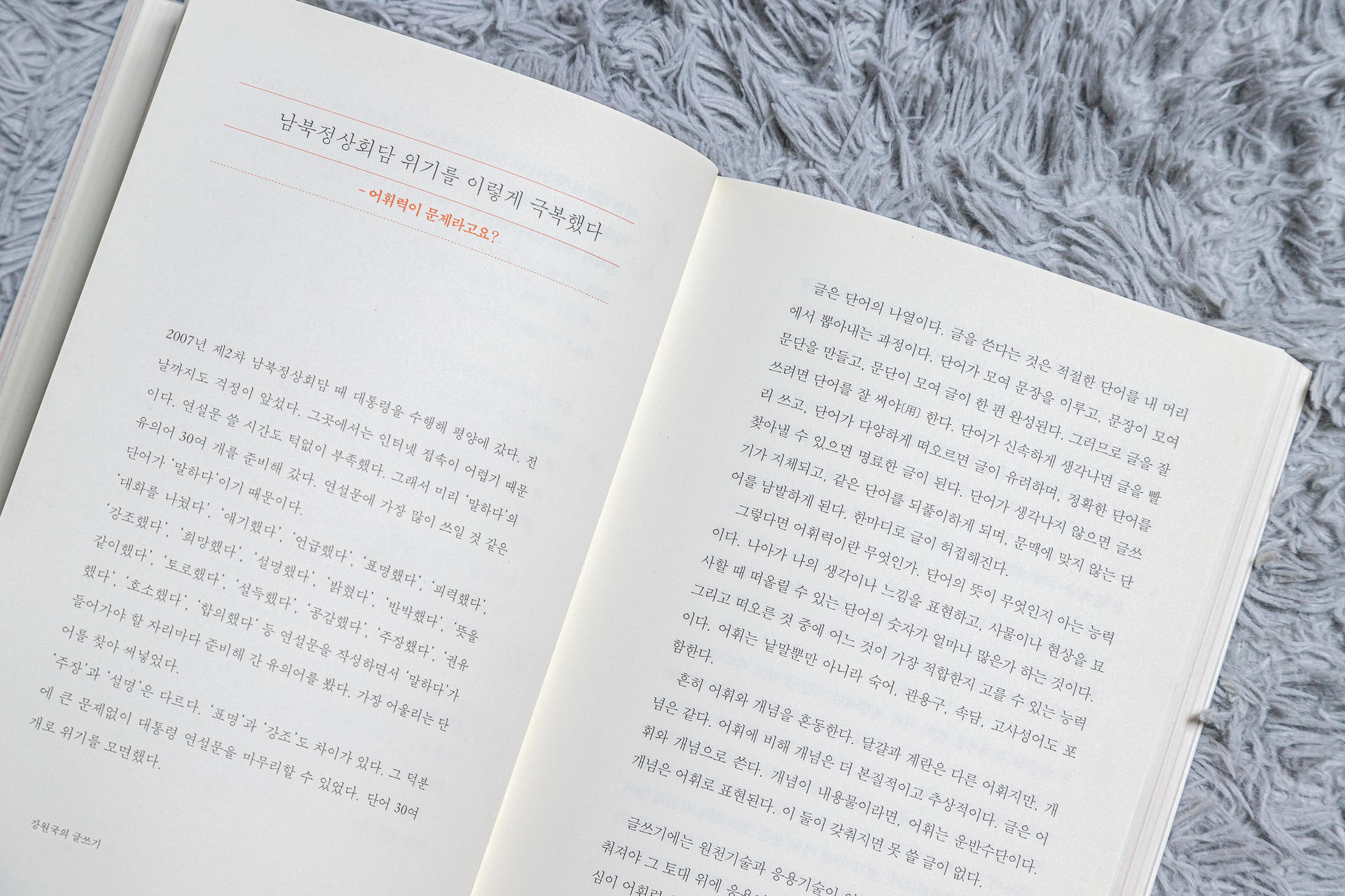 『대통령의 글쓰기』로 첫 단행본을 냈던 강 작가는 이후 글쓰기 강의, 프로그램에 많이 출연합니다. 책 서문에 있는 내용인데 그때마다 "이제 대통령 좀 그만 팔아먹지?"라는 얘기를 들었다고 합니다. 그 때 그는 내가 글을 쓰는 이유와 내 이야기를 하고 싶었다고 밝혔습니다. 그는 '청와대의 경험을 바탕으로 쓴 『대통령의 글쓰기』와 기업에서 겪은 얘기로 만든 『회장님의 글쓰기』, 둘 다 나의 책이 아니다. 관찰기이자 대통령과 회장에게 배운 글쓰기론이다. 이제 비로소 내 얘기를 하려고 한다'라고 쓰고 있습니다.